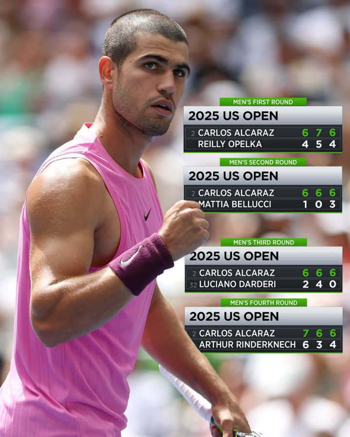 这是阿尔卡拉斯首次以不失一盘的姿态闯入大满贯八强。此前阿尔卡拉斯在大满贯赛事中呈现出较为慢热的姿态,在浅轮次中时常比分焦灼,随着轮次的深入而愈挫愈勇。